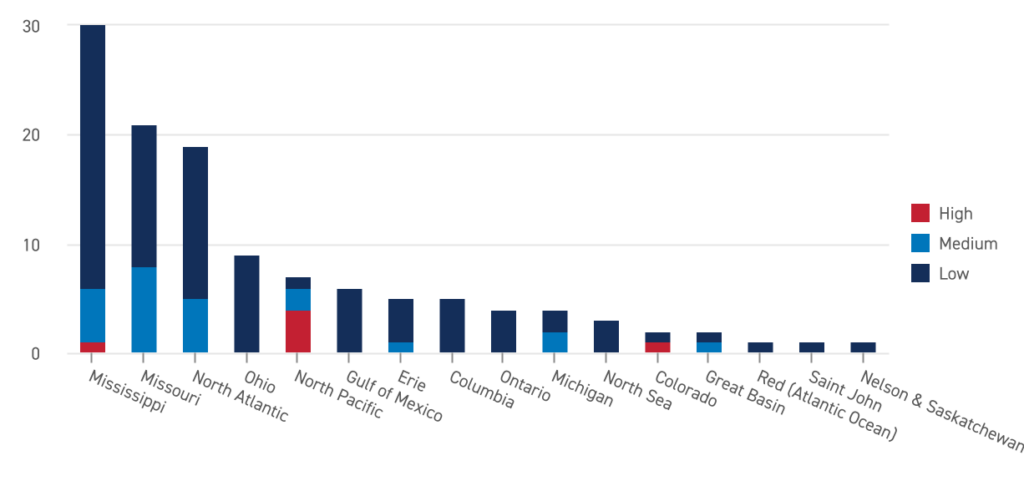 We use the results of our annual global water risk assessments, combined with our water and wastewater performance data, to inform decisions on further assessment, actions and investments. A priority focus is placed on sites located in potentially high water stress geographies to confirm sound water stewardship practices and consider watershed engagement opportunities. The following provides a breakdown of production sites and 3rd-party warehouse and distribution sites by major river basin and projected 2030 regional water stress level.