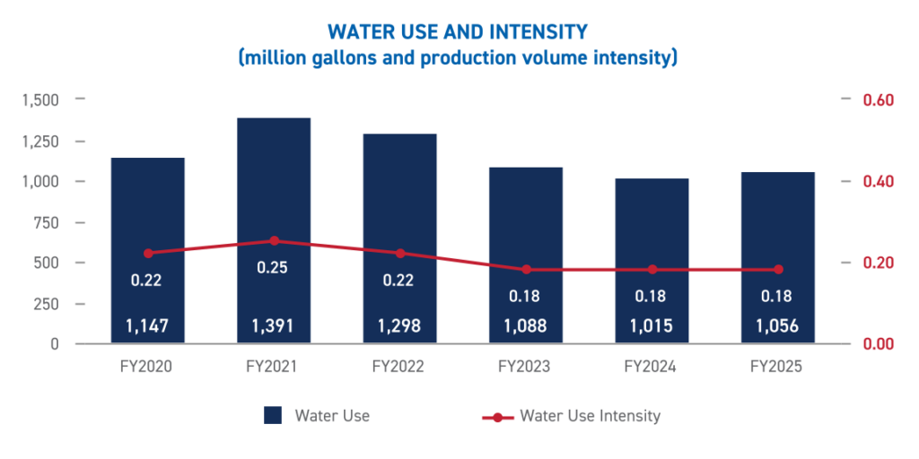 Globally, we source 56% of incoming water from municipal or third-party providers and 44% from groundwater sources. Our water use increased by 4% compared with fiscal year 2024, but our water use intensity decreased by 3%. Our wastewater discharge volume for fiscal year 2025 was 1,778 million gallons for fiscal year 2020 baseline sites and 1,992 million gallons including new operations.